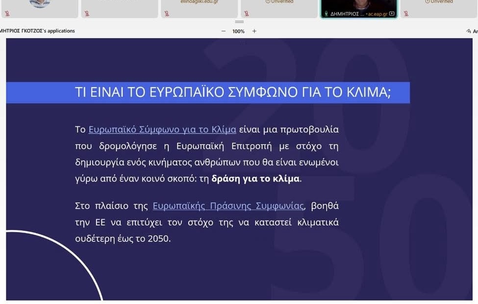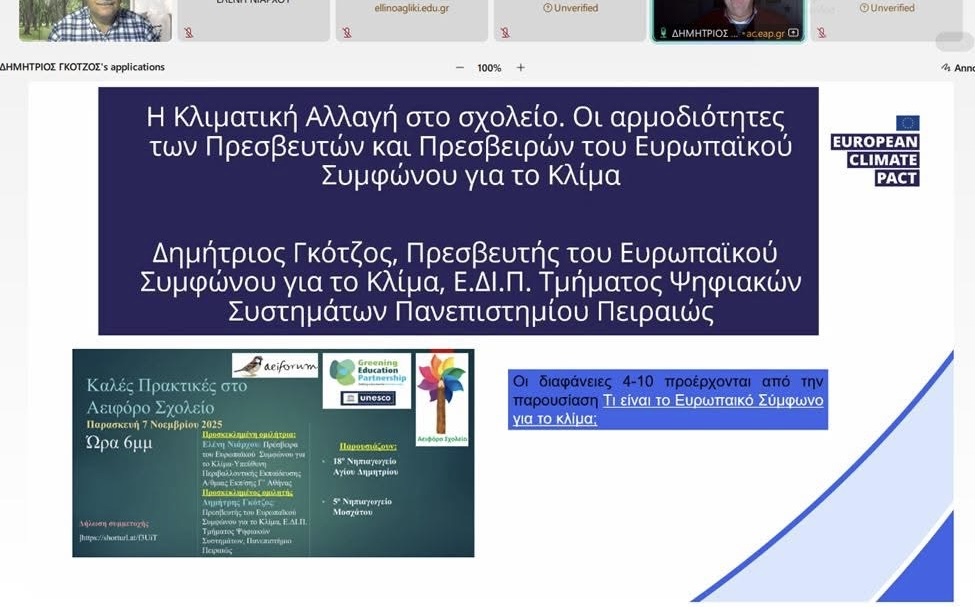 Την Παρασκευή 7 Νοεμβρίου 2025, η κ. M. Σόφη, καθηγήτρια Τεχνολογίας, και η κ. Κ. Πρεβενιού, καθηγήτρια Καλλιτεχνικών, συμμετείχαν στο 2ο διαδικτυακό σεμινάριο του οργανισμού “Αειφόρουμ” με θέμα: «Καλές Πρακτικές στο Αειφόρο Σχολείο». Το σεμινάριο πραγματοποιήθηκε εξ αποστάσεως από τις 18:00 έως τις 21:00 και είχε ως στόχο την ανάδειξη δράσεων και πρωτοβουλιών που προάγουν την αειφορία στην εκπαίδευση. Κατά τη διάρκειά του παρουσιάστηκαν ενδιαφέρουσες εισηγήσεις από διακεκριμένους ομιλητές, μεταξύ των οποίων ο κ. Δημήτρης Καλαϊτζίδης, Πρόεδρος του Αειφόρουμ και Συντονιστής του Δικτύου “Αειφόρο Σχολείο”, η κ. Ελένη Νιάρχου, Πρέσβειρα του Ευρωπαϊκού Συμφώνου για το Κλίμα, καθώς και ο κ. Δημήτρης Γκότζος, Ε.ΔΙ.Π. του Πανεπιστημίου Πειραιώς, μίλησαν για τον ρόλο τους ως πρεσβευτών της Ε.Ε. στην Εκπαίδευση για την Κλιματική Αλλαγή. Παράλληλα, παρουσιάστηκαν καλές πρακτικές από σχολεία που ήδη εφαρμόζουν ολοκληρωμένα προγράμματα περιβαλλοντικής εκπαίδευσης, όπως το 18ο Νηπιαγωγείο Αγίου Δημητρίου και το 5ο Νηπιαγωγείο Μοσχάτου, και πήραν την πιστοποίηση Αειφόρου Σχολείου. Η συμμετοχή των εκπαιδευτικών μας στο σεμινάριο εντάσσεται στο πλαίσιο της συνεχούς επιμόρφωσης του προσωπικού και της δέσμευσης του Σχολείου μας να προάγει την αειφορία, την περιβαλλοντική ευαισθητοποίηση και τη βιωματική μάθηση. Μέσα από τέτοιες πρωτοβουλίες, το Σχολείο μας επιδιώκει να ενισχύει το παιδαγωγικό του έργο, καλλιεργώντας στους μαθητές αξίες υπευθυνότητας, συνεργασίας και σεβασμού προς το περιβάλλον.