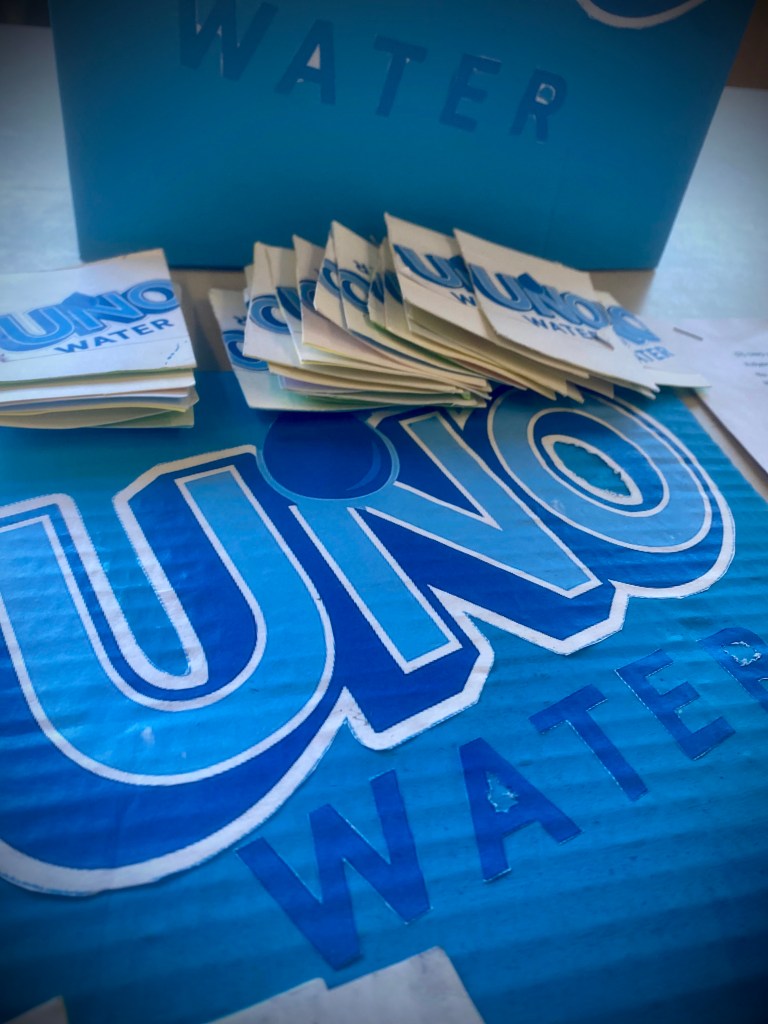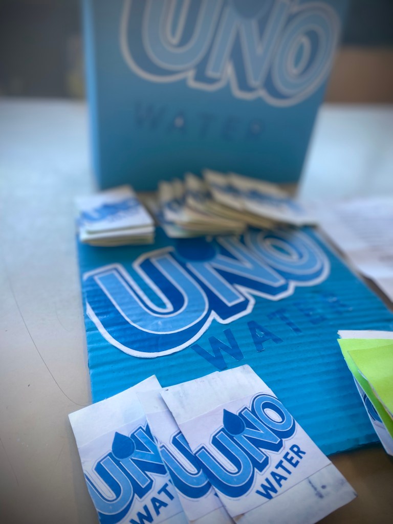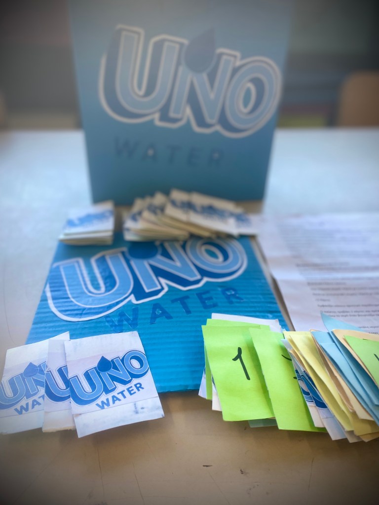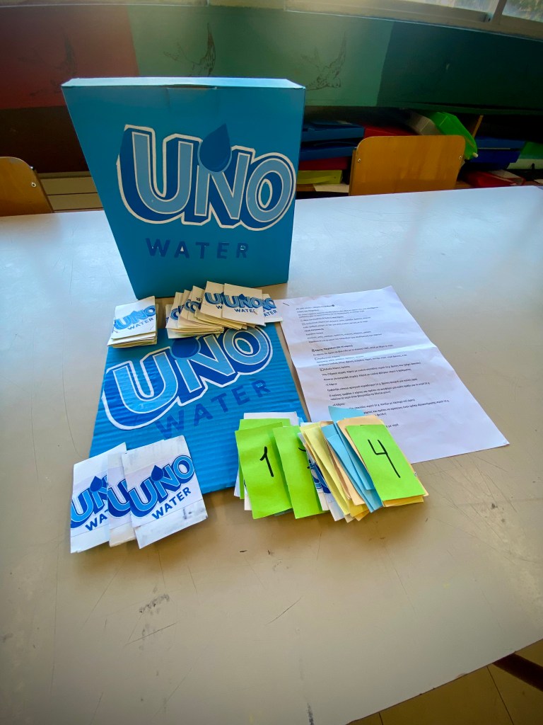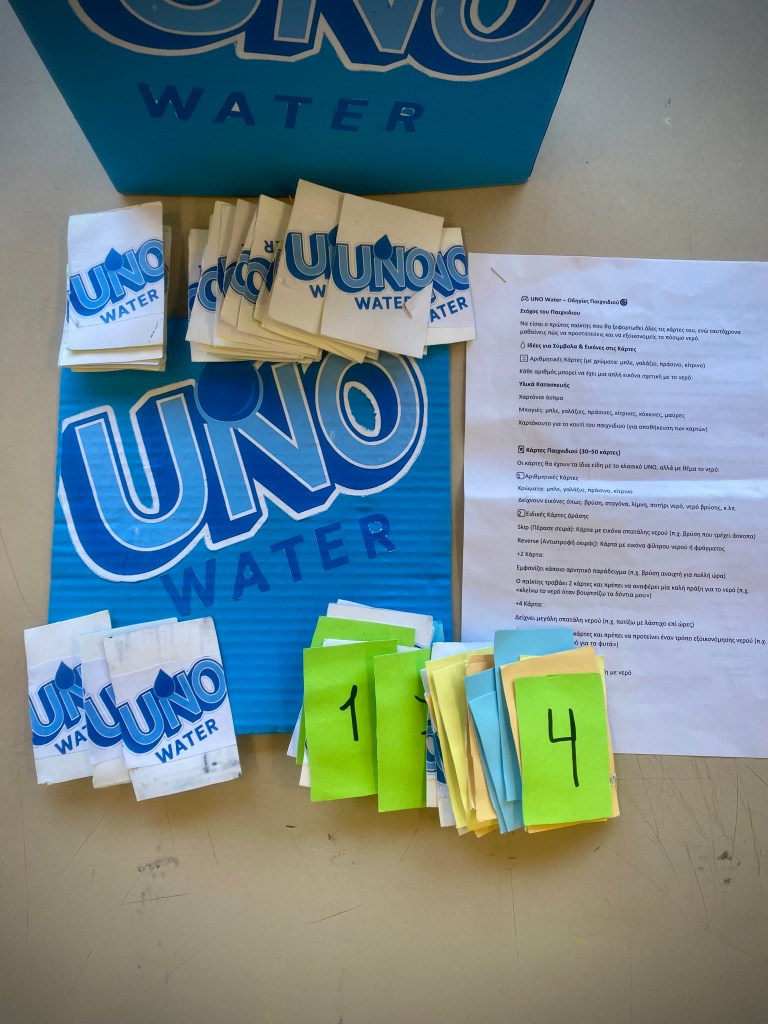 Το uno water είναι ένα επιτραπέζιο παιχνίδι με παιδαγωγικό χαρακτήρα που συνδυάζει την διασκέδαση με την περιβαλλοντική ευαισθητοποίηση μέσα από τις κάρτες του οι παίκτες δεν προσπαθούν μόνο να κερδίσουν αλλά μαθαίνουν να αναγνωρίζουν σωστές και λανθασμένες συνήθειες σχετικά με τη χρήση του κόσμου νερού ειδικές κάρτες προκαλούν τους παίκτες να σκεφτούμε λύσεις να προτείνουν καλές πρακτικές και να αναλάβουν δεσμεύσεις για την προστασία των υδάτινων πόρων. Έτσι το παιχνίδι καλλιεργεί υπευθυνότητα περιβαλλοντική συνείδηση και συνεργατικό πνεύμα μετατρέποντας την γνώση για την εξοικονόμηση νερού σε μία δημιουργική και ευχάριστη εμπειρία μάθησης.