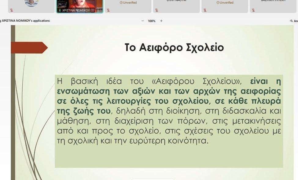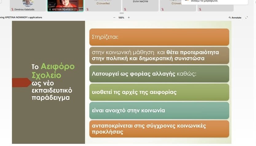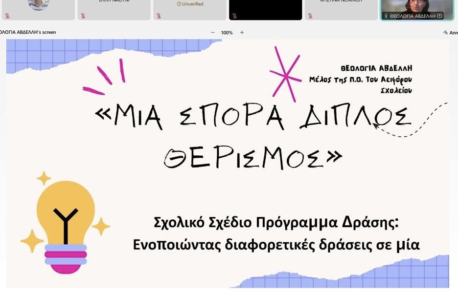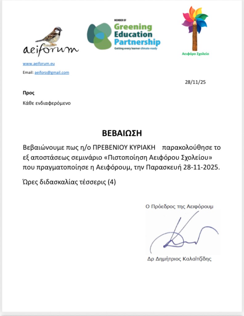 Την Παρασκευή 28/11/2025 η καθηγήτρια των Καλλιτεχνικών του Σχολείου κ. Κ. Πρεβενιού παρακολούθησε το 3ο κατά σειρά επιμορφωτικό σεμινάριο διάρκειας 4 ωρών για το Αειφόρο σχολείο. Οι ομιλητές ήταν οι: Χριστίνα Νομικού, Βέρα Δηλάρη, Θεολογία Αβδελή, Έλλη Ναούμ, Ανδρονίκη Κατωπόδη που παρουσίασαν όλες τις πτυχές της πιστοποίησης Αειφόρου Σχολείου. Το επόμενο επιμορφωτικό σεμινάριο έχει προγραμματιστεί για τις 8 Δεκεμβρίου 2025, στο οποίο θα γίνει μια πολύ ενδιαφέρουσα παρουσίαση της Παιδαγωγικής Φρενέ σε σχέση με το Αειφόρο Σχολείο.