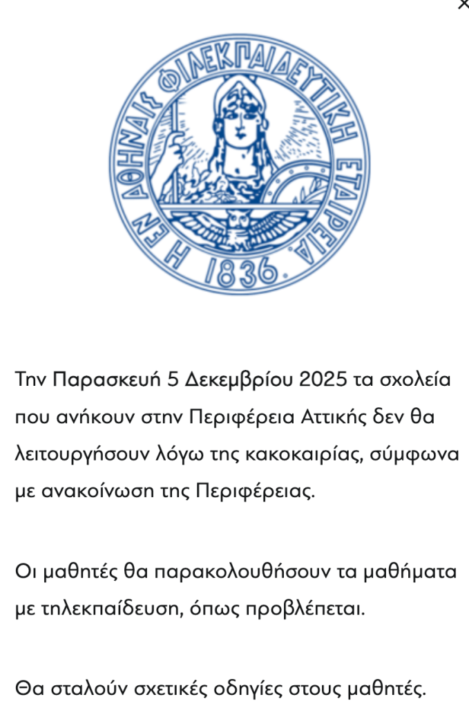 Με απόφαση του Περιφερειάρχη Αττικής, την Παρασκευή 5 Δεκεμβρίου 2025 θα παραμείνουν κλειστά όλα τα δημόσια και ιδιωτικά σχολεία Πρωτοβάθμιας και Δευτεροβάθμιας Εκπαίδευσης του Λεκανοπεδίου, ενόψει του κύματος κακοκαιρίας Byron.