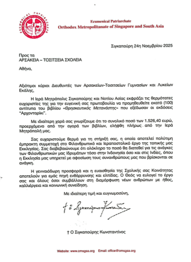 Τα Αρσάκεια-Τοσίτσεια Γυμνάσια και Λύκεια προχώρησαν σε μια πρωτοβουλία που συνδέει τη γνώση με την αλληλεγγύη. Μέσα από τη διάθεση του βιβλίου «Θρησκευτικός μετανάστης», οι μαθητές, οι γονείς και οι διδάσκοντες συμμετείχαν σε μια κοινή προσπάθεια: τα έσοδα από τις πωλήσεις (1600 ευρώ) συγκεντρώθηκαν και παραδόθηκαν εξολοκλήρου στον Σεβασμιώτατο Μητροπολίτη Σιγκαπούρης και Νοτίου Ασίας κ. Κωνσταντίνο.
