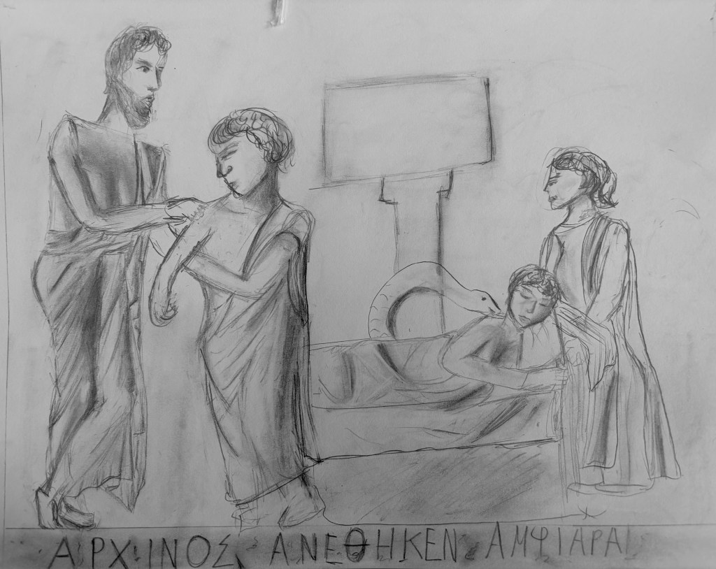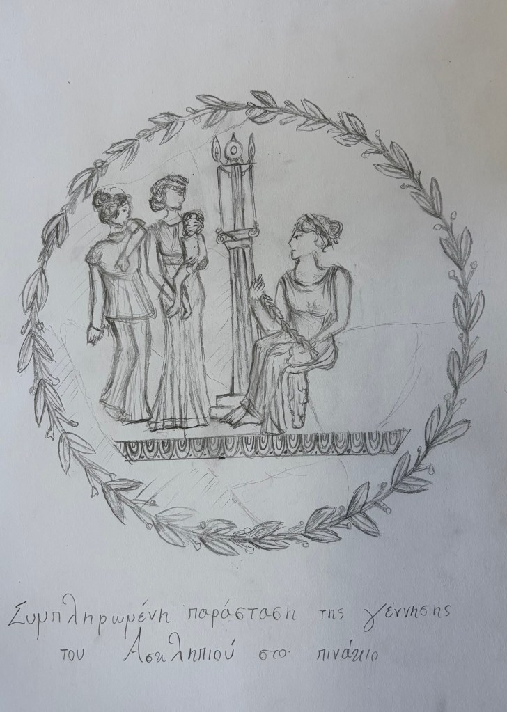Οι μαθητές μελέτησαν την αρχαία παράσταση της γέννησης του Ασκληπιού και προχώρησαν σε συμπληρωμένη εικαστική απόδοση, δίνοντας μορφή σε χαμένα ή φθαρμένα στοιχεία. Μέσα από τη σύγχρονη ερμηνεία, ανέδειξαν τη μυθολογική καταγωγή της ιατρικής και τη διαχρονική σημασία της θεραπείας ως πράξης φροντίδας.