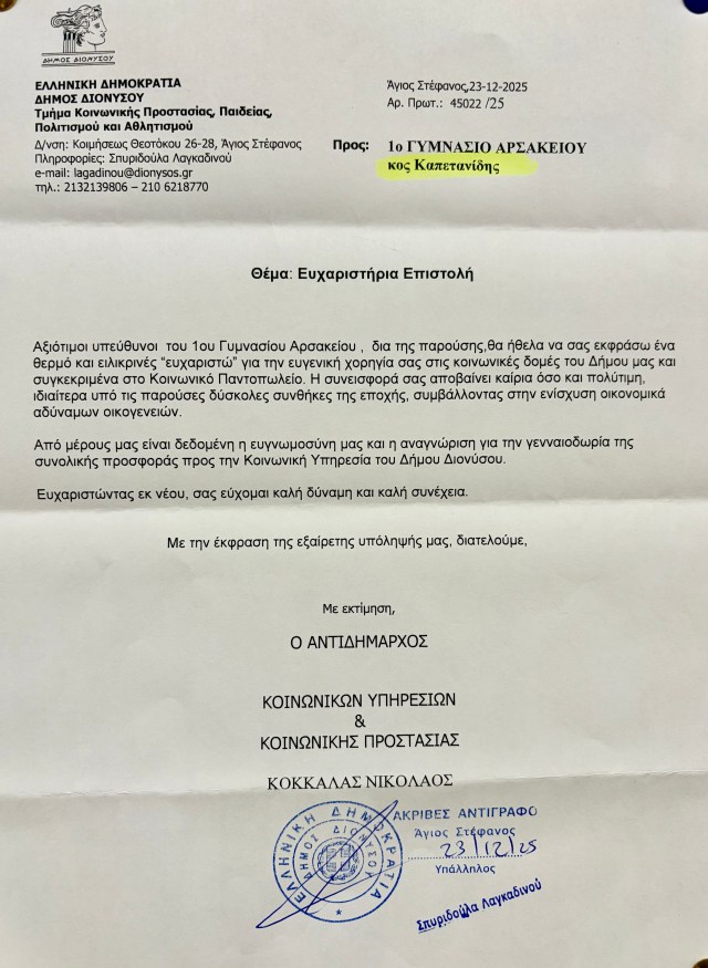 Το Α’ Αρσάκειο-Τοσίτσειο Γυμνάσιο Εκάλης έλαβε ευχαριστήρια επιστολή από τον Δήμο Διονύσου και συγκεκριμένα από το Τμήμα Κοινωνικής Προστασίας, Παιδείας, Πολιτισμού και Αθλητισμού, με την οποία εκφράζονται θερμές ευχαριστίες για την ευγενική χορηγία και τη στήριξη του Σχολείου μας προς τις κοινωνικές δομές του Δήμου, και ειδικότερα προς το Κοινωνικό Παντοπωλείο. Πιο συγκεκριμένα, οι μαθητές του Γαλλικού τμήματος με υπεύθυνη την κ. Τρ. Κικίλια, καθηγήτρια Γαλλικών, συγκέντρωσαν τρόφιμα μακράς διαρκείας τα οποία προσέφεραν στο Κοινωνικό Παντοπωλείο του Δήμου Διονύσου. Στην επιστολή τονίζεται ότι η προσφορά της σχολικής μας κοινότητας υπήρξε ιδιαίτερα σημαντική και πολύτιμη, ιδίως κατά τη δύσκολη αυτή χρονική περίοδο, συμβάλλοντας ουσιαστικά στην ενίσχυση οικονομικά αδύναμων οικογενειών και στη συνολική υποστήριξη της Κοινωνικής Υπηρεσίας του Δήμου Διονύσου. Η αναγνώριση αυτή αποτελεί τιμή για τα Αρσάκεια-Τοσίτσεια Σχολεία και επιβεβαιώνει τη σημασία της κοινωνικής ευαισθητοποίησης, της αλληλεγγύης και της ενεργού συμμετοχής των μαθητών, των εκπαιδευτικών και των οικογενειών τους σε δράσεις κοινωνικής προσφοράς. Και τη νέα χρονιά θα συνεχίσουμε με συνέπεια να στηρίζουμε πρωτοβουλίες που προάγουν την κοινωνική συνοχή και τον ανθρωπισμό.