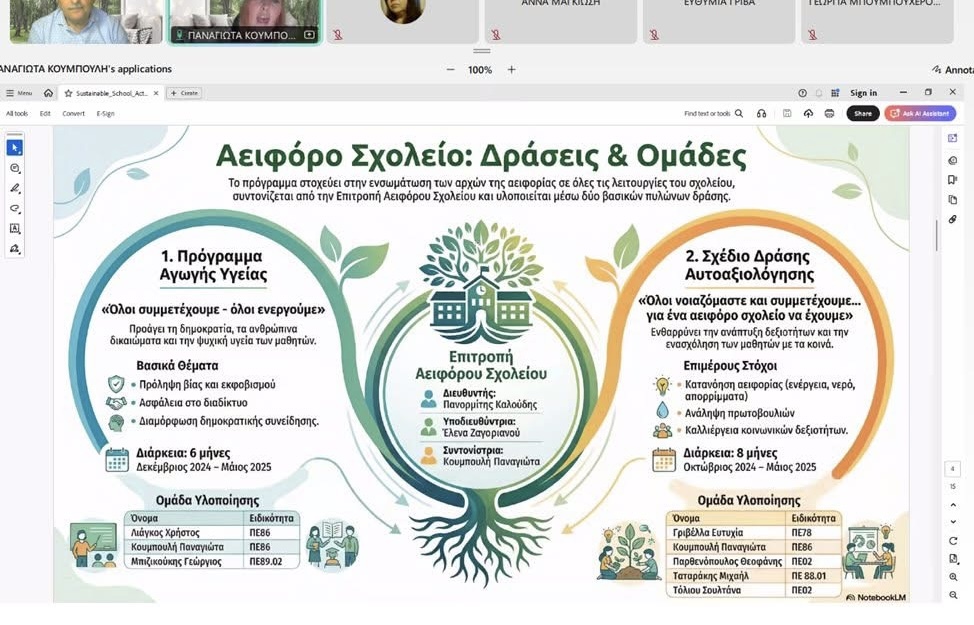 Την Παρασκευή 23 Ιανουαρίου 2026, οι καθηγήτριες του Σχολείου μας, κ. Μ. Σόφη, Τεχνολογίας, και κ. Κ. Πρεβενιού, Καλλιτεχνικών, παρακολούθησαν μία ακόμη επιμορφωτική συνάντηση με θέμα το Αειφόρο Σχολείο, στο πλαίσιο των δράσεων του Αειφόρουμ. Η διαδικτυακή συνάντηση υπήρξε εξαιρετικά ενδιαφέρουσα. Κεντρικός ομιλητής ήταν ο ομότιμος καθηγητής Παιδαγωγικής του Πανεπιστημίου Ιωαννίνων κ. Γιώργος Μαυρογιώργος, του οποίου η ομιλία ήταν ιδιαίτερα γόνιμη, θέτοντας ουσιαστικούς προβληματισμούς γύρω από τη σχολική αυτονομία και την αειφορία στην εκπαίδευση. Στο πλαίσιο της συνάντησης παρουσιάστηκαν επίσης καλές πρακτικές από δύο σχολικές μονάδες που έχουν λάβει επάξια την Πιστοποίηση Αειφόρου Σχολείου: το ΕΕΕΕΚ Ρόδου, με εισηγήτρια την κ. Παναγιώτα Κουμπουλή, και το Νηπιαγωγείο Πενταβρύσου Καστοριάς, με εισηγήτρια την κ. Ελένη Ζησοπούλου. Οι παρουσιάσεις ανέδειξαν ουσιαστικές δράσεις που προάγουν την αειφορία και τη συμμετοχική σχολική κουλτούρα. Το σχολείο μας παραμένει ενεργά προσανατολισμένο στην αειφορία, προωθώντας μια σύγχρονη και ποιοτική εκπαιδευτική πραγματικότητα. Το επόμενο επιμορφωτικό σεμινάριο είναι προγραμματισμένο για τις 26 Φεβρουαρίου 2026.