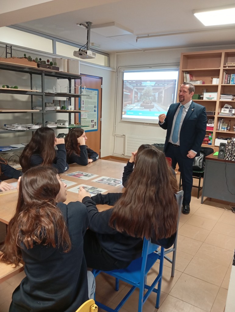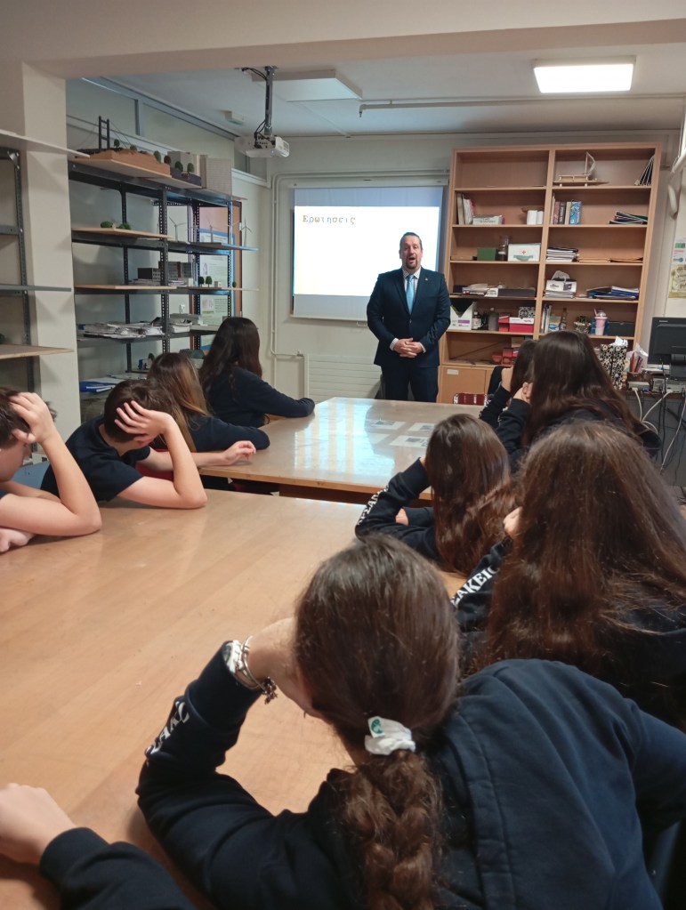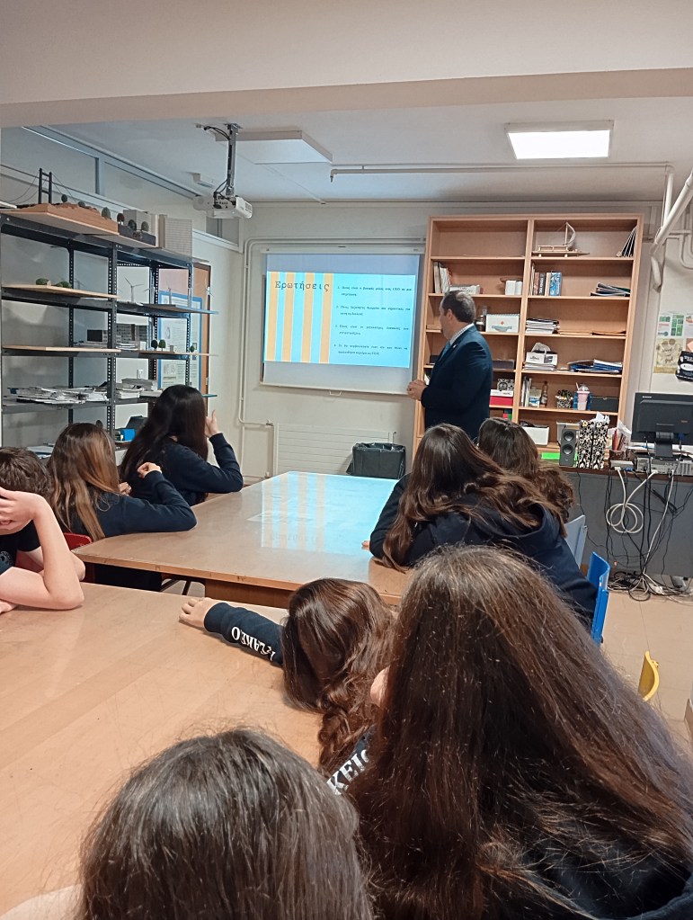 Την Πέμπτη 11 Δεκεμβρίου, το τμήμα Β4/1 του Γυμνασίου είχε την ξεχωριστή τιμή να φιλοξενήσει στο Εργαστήριο Τεχνολογίας τον κ. Γεώργιο Σταματίου, CEO (Chief Executive Officer) σε μεγάλες ξενοδοχειακές μονάδες. Η συνάντηση αυτή αποτέλεσε γέφυρα ανάμεσα στον κόσμο της εκπαίδευσης και τον κόσμο των επιχειρήσεων, δίνοντας στους μαθητές τη δυνατότητα να γνωρίσουν από κοντά τον ρόλο ενός ηγέτη. Ο κ. Σταματίου, με τον εγκάρδιο και φιλικό του χαρακτήρα, μίλησε με απλότητα και σαφήνεια, κάνοντας τη συζήτηση προσιτή και ουσιαστική. Απάντησε στις ερωτήσεις των μαθητών σχετικά με τον βασικό ρόλο ενός CEO, τις δεξιότητες που απαιτούνται για αυτή τη θέση, τις δυσκολίες που αντιμετωπίζει και τις συμβουλές του προς νέους που θέλουν να ακολουθήσουν μια τέτοια πορεία. Παράλληλα, έδωσε πρακτικές συμβουλές με παραδείγματα για τις επωνυμίες και τα λογότυπα που σχεδιάζουν οι μαθητές στο μάθημα, ενθαρρύνοντάς τους να συνδυάζουν δημιουργικότητα με σαφήνεια και επαγγελματισμό. Η ανταλλαγή απόψεων ήταν ουσιαστική και κράτησε αμείωτο το ενδιαφέρον των μαθητών. Το Εργαστήριο Τεχνολογίας μετατράπηκε σε χώρο διαλόγου και έμπνευσης, όπου η εκπαίδευση συνάντησε την πραγματικότητα της αγοράς, προσφέροντας σε όλους μια πολύτιμη εμπειρία.