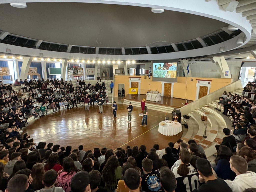 Στο πλαίσιο των ErasmusDays 2025 και με κεντρικό θέμα «Οι αξίες μας, έμπνευση για το μέλλον», πραγματοποιήθηκε στο σχολείο μας η δράση «Ζωντανός Τοίχος Αξιών». Η ημέρα ξεκίνησε με ενημέρωση των μαθητών κατά την πρωινή προσευχή, όπου παρουσιάστηκε τι είναι οι ErasmusDays καθώς και ποια θα είναι η φετινή συμμετοχή του σχολείου μας στο πλαίσιο του προγράμματος Erasmus+. Στη συνέχεια, οι μαθητές κλήθηκαν να συμμετάσχουν στη δράση, η οποία πραγματοποιήθηκε σε κεντρικό διάδρομο του σχολείου. Εκεί είχε τοποθετηθεί ένα ειδικό ταμπλό, αφιερωμένο στις έξι θεμελιώδεις αξίες της Ευρωπαϊκής Ένωσης: Ανθρώπινη Αξιοπρέπεια, Ελευθερία, Δημοκρατία, Ισότητα, Κράτος Δικαίου και Ανθρώπινα Δικαιώματα. Οι μαθητές έγραψαν σε χρωματιστά χαρτάκια τις δικές τους σκέψεις, ιδέες ή φράσεις που αποτυπώνουν τις αξίες αυτές, δημιουργώντας έναν πολύχρωμο και συμβολικό «Ζωντανό Τοίχο Αξιών» – μια δημιουργική συλλογική απεικόνιση των αξιών που μας ενώνουν ως Ευρωπαίους πολίτες. Η δράση πραγματοποιήθηκε με την επιμέλεια και καθοδήγηση της κ. Μ. Στούπα, καθηγήτριας Αγγλικών και υπεύθυνης του προγράμματος Erasmus+, ενώ την καλλιτεχνική επιμέλεια του ταμπλό είχε η κ. Κ. Πρεβενιού, καθηγήτρια Καλλιτεχνικών.