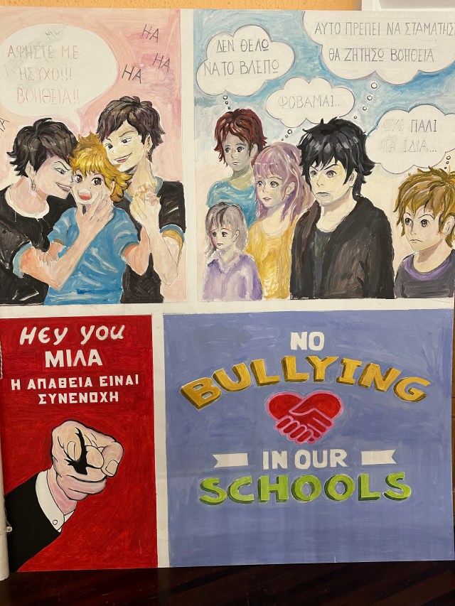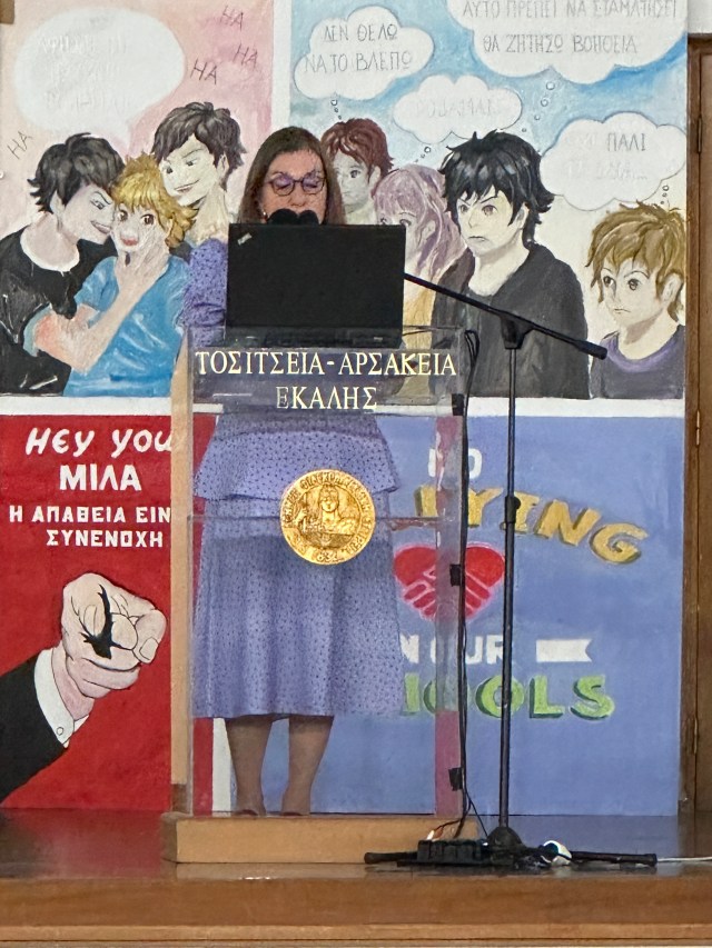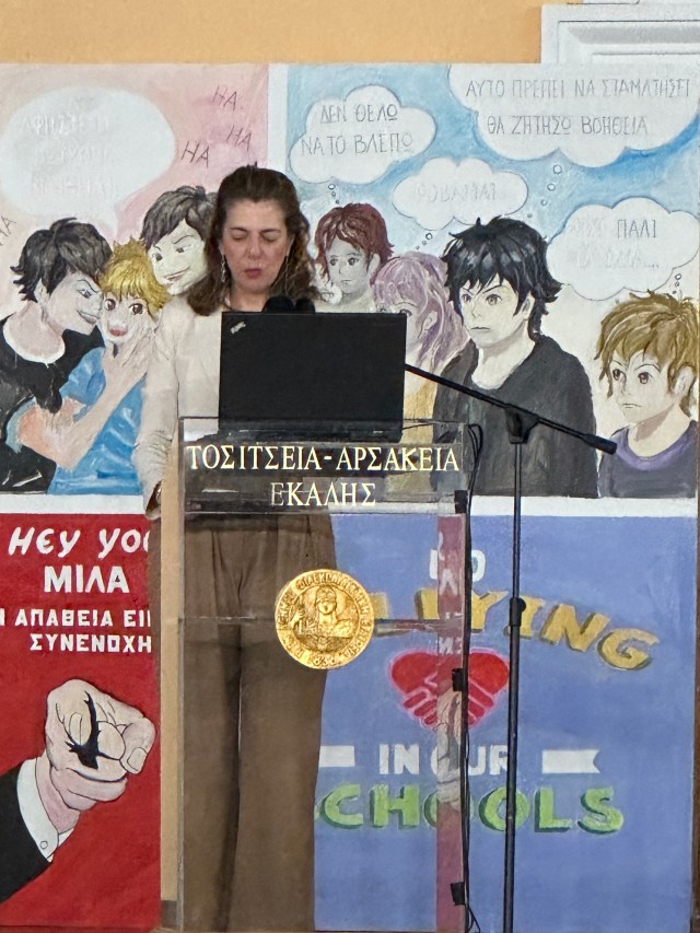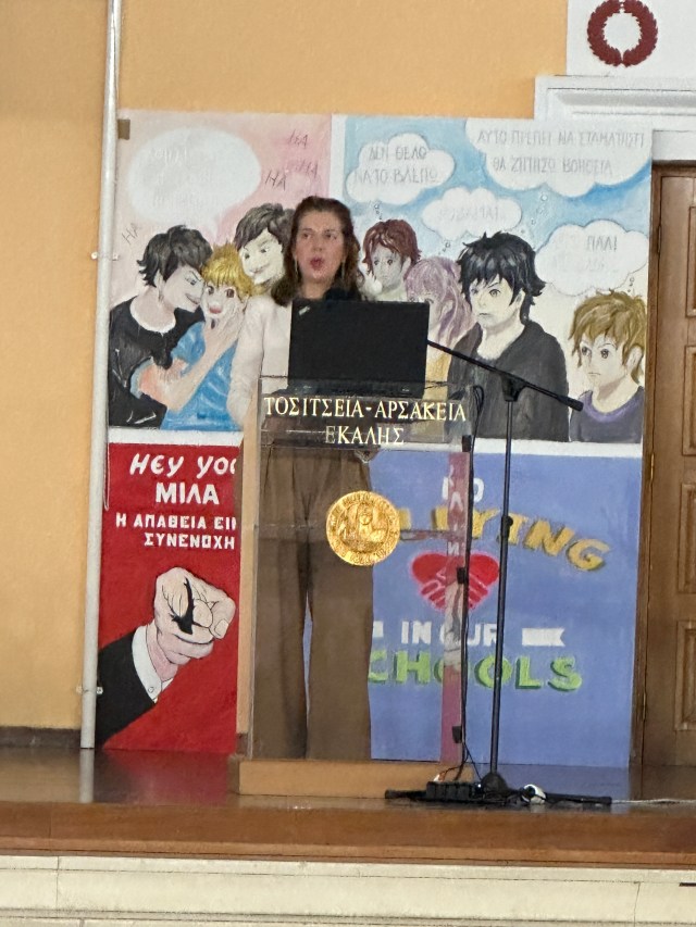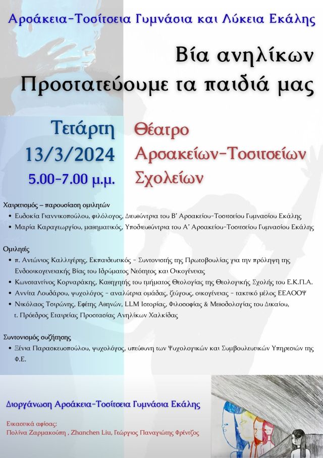 Με αφορμή την πανελλήνια ημέρα κατά της Σχολικής Βίας και του Εκφοβισμού (6 Μαρτίου), έλαβε χώρα την Τετάρτη 13 Μαρτίου 2024 και ώρα 17:00 στο Θέατρο των Αρσακείων-Τοσιτσείων Σχολείων Εκάλης ενημερωτική εκδήλωση, που διοργάνωσαν από κοινού τα Αρσάκεια-Τοσίτσεια Γυμνάσια και Λύκεια, με θέμα «Βία ανηλίκων. Προστατεύουμε τα παιδιά μας». Την εκδήλωση προετοίμασαν και πλαισίωσαν αρκετοί συνάδελφοι και συγκεκριμένα η κ. Κυριακή Πρεβενιού, η οποία επιμελήθηκε την πρόσκληση και την αφίσα ενώ παράλληλα είχε την επίβλεψη της δημιουργίας εικαστικών έργων των μαθητών μας του Α’ Γυμνασίου που εκτέθηκαν σε δύο ταμπλό στον χώρο του Θεάτρου. Αντίστοιχα, η καθηγήτρια κ. Ζήνα Κωτσοπούλου, καθηγήτρια Καλλιτεχνικών, καθοδήγησε τους μαθητές του Β’ Γυμνασίου να δημιουργήσουν δύο μεγάλα ταμπλό με εντυπωσιακά ζωγραφικά σχέδια, τα οποία κόσμησαν τη σκηνή κατά τη διάρκεια της εκδήλωσης, καθώς και ένα μεγάλο ταμπλό με έργα μαθητών που κοσμεί τον περιβάλλοντα χώρο του Θεάτρου. Επιπλέον, η θεολόγος του Β’ Γυμνασίου κ. Ηρώ Νικολοπούλου ετοίμασε με μαθητές της ένα κολάζ με τον τίτλο «Σύγχρονη Βαβέλ». Την επίβλεψη της τρισδιάστατης εκτύπωσης του κολάζ καθώς και τη δημιουργία του διαφημιστικού βίντεο-σποτ της εκδήλωσης είχε η καθηγήτρια Πληροφορικής του Β’ Γυμνασίου κ. Ξένια Τριάντη.