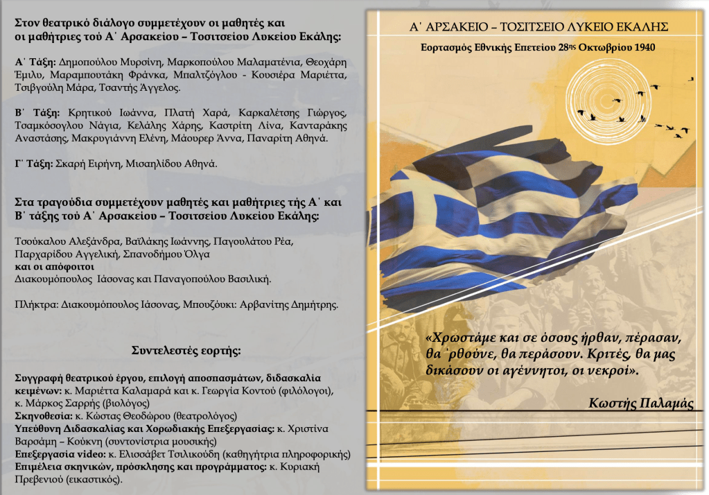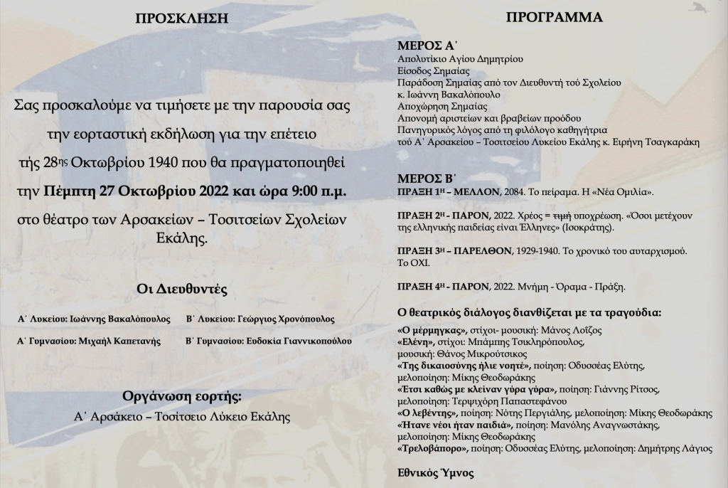 Το Α΄ Αρσάκειο-Τοσίτσειο Γυμνάσιο Εκάλης τίμησε τη Δευτέρα 24 Οκτωβρίου 2022 την εθνική επέτειο της 28ης Οκτωβρίου. Στο Θέατρο του Σχολείου πραγματοποιήθηκε η τελετή παράδοσης της Σημαίας από τον Διευθυντή του Σχολείου μας κ. Μιχάλη Καπετανή στη μαθήτρια τής Γ΄ τάξης Σοφία Βασιλείου του Παναγιώτη, που ορίστηκε ως σημαιοφόρος. Επίσης, επιδόθηκαν τα βραβεία και τα αριστεία στους πρωτεύσαντες και αριστεύσαντες μαθητές κατά το σχολικό έτος 2021-2022. Κατόπιν, εκφωνήθηκε ο επετειακός πανηγυρικός λόγος από τη φιλόλογο του Σχολείου μας κ. Σοφία Κοντονίκα και, εν συνεχεία, οι μαθητές παρακολούθησαν την εορτή για την εθνική μας επέτειο, την οποία επιμελήθηκε το Α΄ Αρσάκειο-Τοσίτσειο Λύκειο. Ακολουθεί το πρόγραμμα της γιορτής με όλους τους συντελεστές.