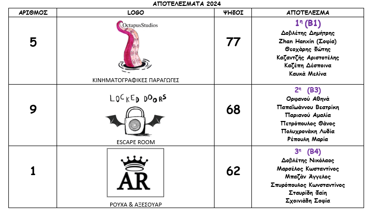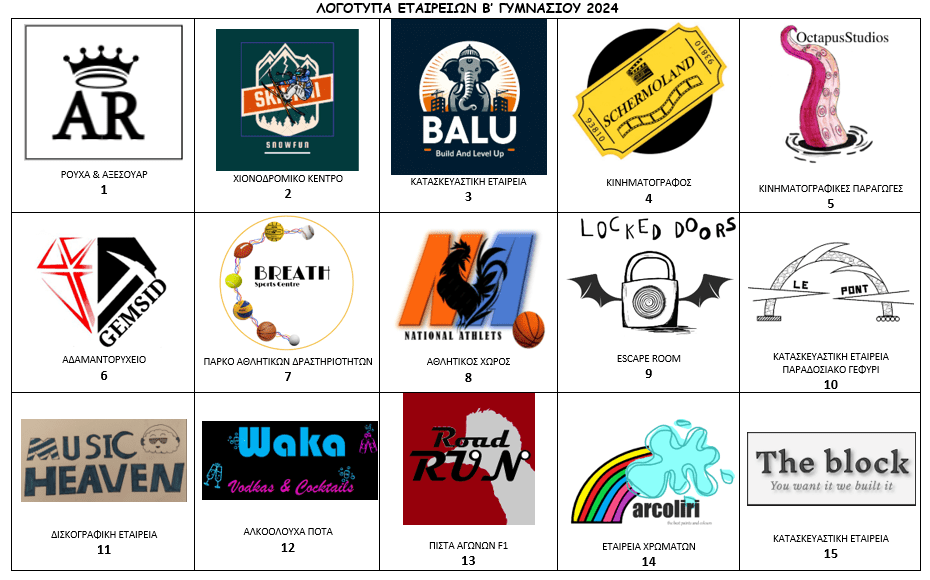 Οι μαθητές όλων των τμημάτων της Β’ δημιούργησαν στο μάθημα της Τεχνολογίας τις δικές τους επιχειρήσεις, με κύριο γενικό σκοπό να αποκτήσουν γνώση της δομής των επιχειρήσεων και του τρόπου λειτουργίας τους. Οργανώθηκαν σε ομάδες, με καταιγισμό ιδεών αποφάσισαν το είδος της επιχείρησης και επέλεξαν ρόλους Διευθυντών για την οργάνωση των εταιρειών τους. Στη συνέχεια «βάφτισαν» τις επιχειρήσεις τους και μέσα από συζητήσεις με φαντασία, έντονες αντιπαραθέσεις και επιχειρήματα σχεδίασαν την επωνυμία και το λογότυπο των εταιρειών τους ως εξής: