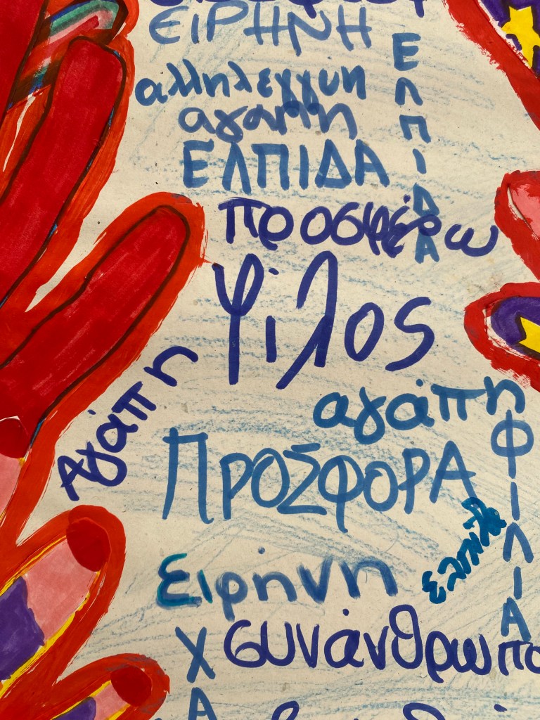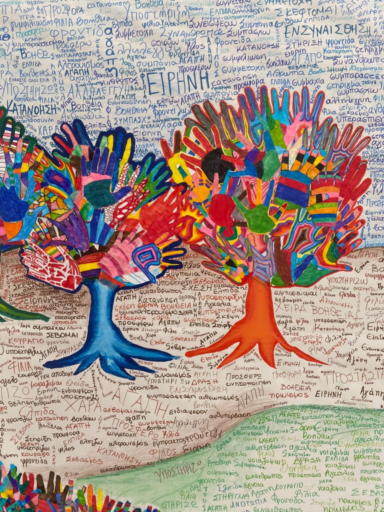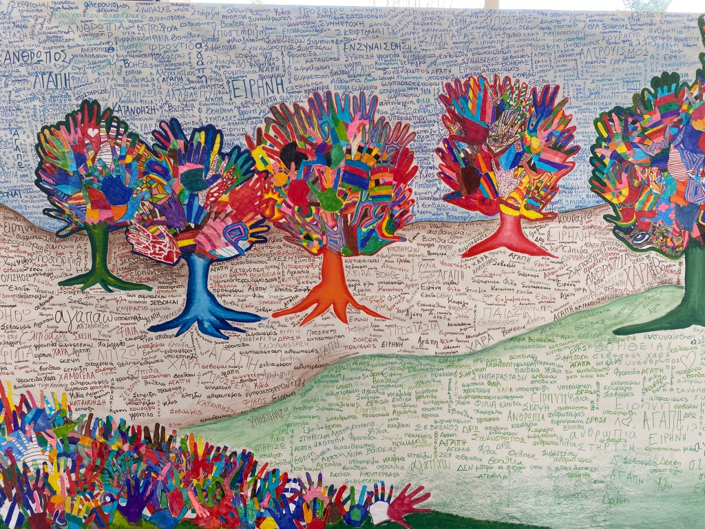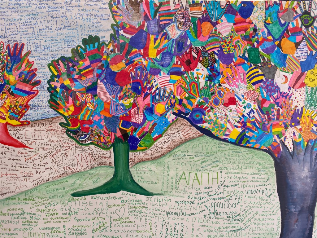 Συγκεκριμένα, όλα τα τμήματα του Σχολείου μας ζωγράφισαν με προθυμία και αγκάλιασαν από την αρχή αυτήν την προσπάθεια. Το έργο έχει τίτλο «Το δάσος της αγάπης». Είναι ένα κολάζ από χέρια, τα χέρια των παιδιών, ζωγραφισμένα με τα πιο χαρούμενα και αισιόδοξα χρώματα. Ένα έργο που υποδηλώνει την αξία της προσφοράς και της αλληλεγγύης, της δοτικότητας, της ελπίδας και της αγάπης. Το έργο πλαισιώνεται με λέξεις που έγραψαν οι μαθητές που περιγράφουν αυτήν την προσπάθεια. Λέξεις όπως: βοήθεια, ανθρωπιά, αγάπη, υποστήριξη!