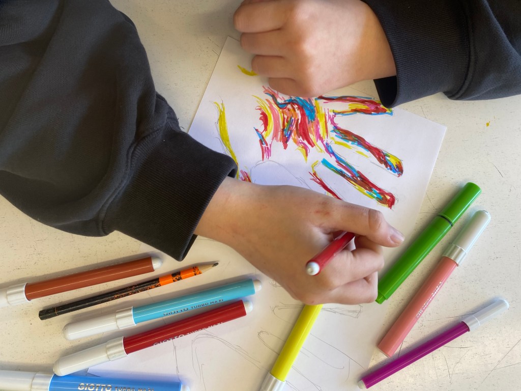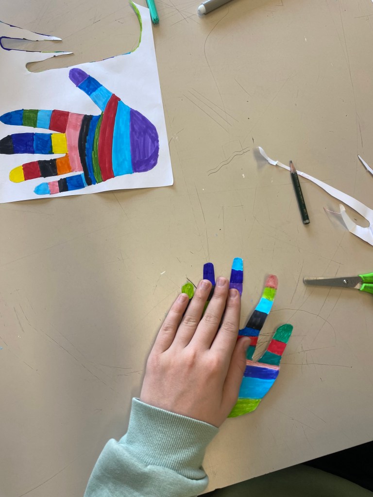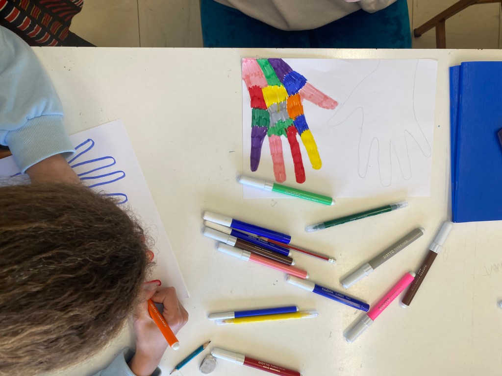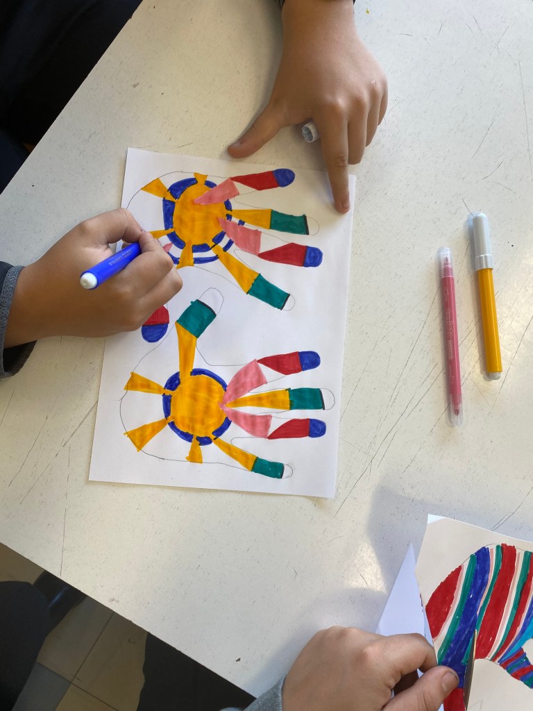 Συγκεκριμένα, όλα τα τμήματα του Σχολείου μας ζωγράφισαν με προθυμία και αγκάλιασαν από την αρχή αυτήν την προσπάθεια. Το έργο έχει τίτλο «Το δάσος της αγάπης». Είναι ένα κολάζ από χέρια, τα χέρια των παιδιών, ζωγραφισμένα με τα πιο χαρούμενα και αισιόδοξα χρώματα. Ένα έργο που υποδηλώνει την αξία της προσφοράς και της αλληλεγγύης, της δοτικότητας, της ελπίδας και της αγάπης. Το έργο πλαισιώνεται με λέξεις που έγραψαν οι μαθητές που περιγράφουν αυτήν την προσπάθεια. Λέξεις όπως: βοήθεια, ανθρωπιά, αγάπη, υποστήριξη!