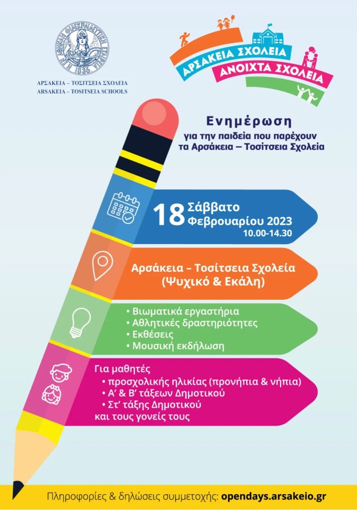 Στις 18 Φεβρουαρίου 2023 τα Αρσάκεια-Τοσίτσεια Σχολεία Εκάλης άνοιξαν τις πύλες τους και κάλεσαν γονείς και παιδιά όλων των ηλικιών, να βιώσουν από κοντά την εμπειρία της φοίτησης που παρέχουν και να πληροφορηθούν για τους στόχους της συνολικής δράσης τους μέσα από ξεναγήσεις, ομιλίες, δραστηριότητες και βιωματικά εργαστήρια. Κάθε βαθμίδα εκπαίδευσης είχε ετοιμάσει ένα ξεχωριστό πρόγραμμα. Συγκεκριμένα, οι μαθητές του Γυμνασίου παρουσίασαν με την καθοδήγηση των καθηγητών τους το ιστολόγιο (μαθητική παρουσία) και το ηλεκτρονικό περιοδικό (ΣΧΟΛΕΙΑ-ζω) του Σχολείου μας, πειράματα Χημείας, Βιολογίας και Φυσικής, πρωτότυπα μαθηματικά παιχνίδια, δειγματική ανασκαφή, δημιουργικές χειροτεχνίες, ενδιαφέροντα σκακιστικά προβλήματα, κατασκευές και εργασίες της εκπαιδευτικής ρομποτικής, θεατρικό παιχνίδι, περιβαλλοντικές δράσεις, όπως η διαδικασία παραγωγής οργανικού λιπάσματος (κομποστοποίηση), αλλά και αθλοπαιδιές. Επίσης, οι Διευθυντές των Γυμνασίων και των Λυκείων ενημέρωσαν στον χώρο του Αμφιθεάτρου τους επισκέπτες για τη γενικότερη λειτουργία του Σχολείου, ενώ παράλληλα καθηγητές μας παρουσίασαν την ηλεκτρονική πλατφόρμα e-arsakeio και τις δυνατότητες που προσφέρει στη διδασκαλία των μαθημάτων. Η εκδήλωση έκλεισε με μία υπέροχη συναυλία από τον Μουσικό Όμιλο των Αρσακείων Σχολείων. Γονείς και μαθητές εξέφρασαν τον ενθουσιασμό τους όχι μόνο για την άρτια οργάνωση της εκδήλωσης, αλλά και για το ευχάριστο και ζεστό κλίμα!